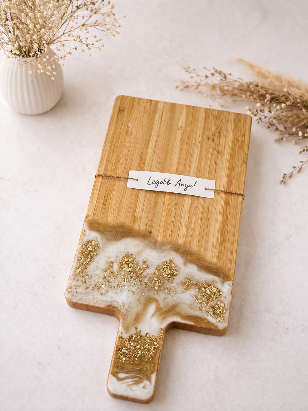 "Arany-fehér epoxi gyanta fedésű vágódeszka, különleges ajándék, anyák napja, köszönőajándék"#01
