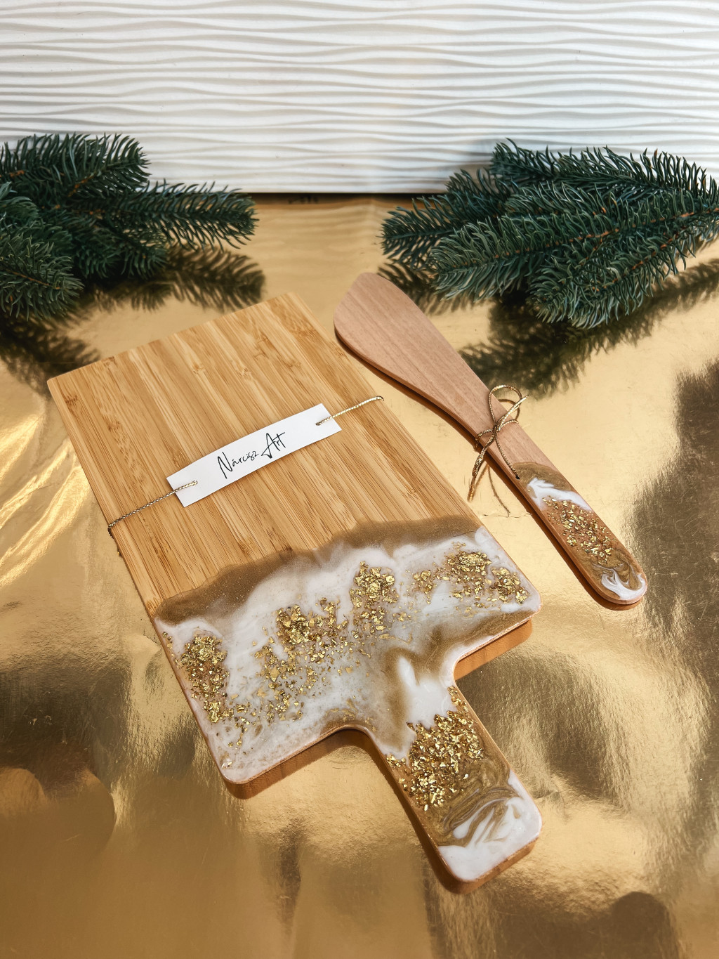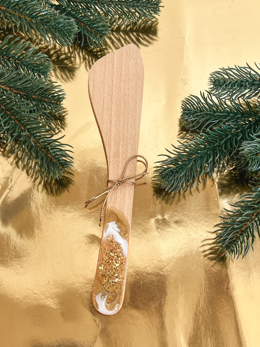 Az aranyló csillogás, a finom fehér elegancia, és a tükörsima epoxi gyanta olyan hangulatot teremt, mintha minden használatnál egy picit ünnepelne a lelkünk is.