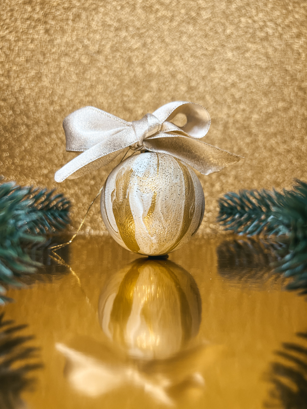 "Arany - fehér metál márványos karácsonyi gömb"#02