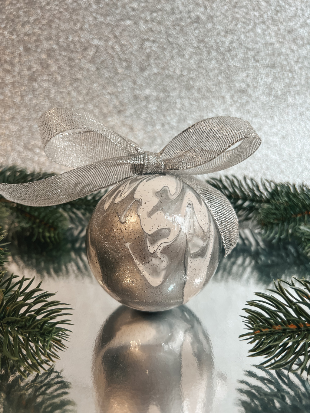 "Ezüst - fehér metál márványos karácsonyi gömb"#03