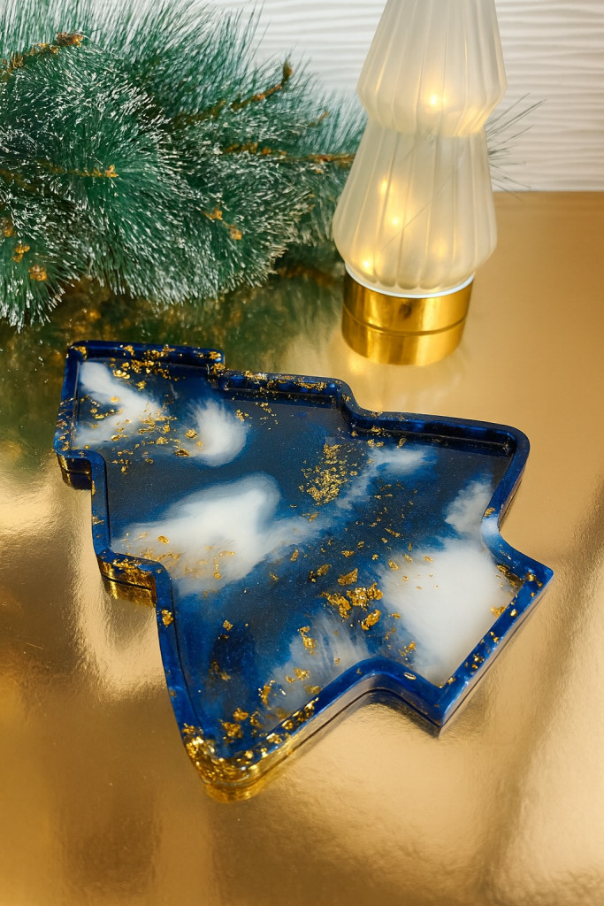 "Sötétkék-fehér-arany epoxi gyanta fenyőfa formájú sütis kínálótál"#02